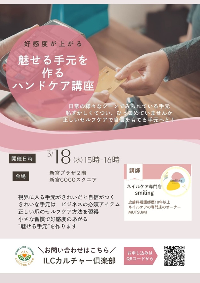 好感度が上がる「魅せる手元」を作るハンドケア講座が開催されます。
