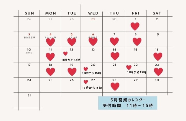 5月の営業日です 月末は休業日が多いのでお早めにご予約お願いいたします